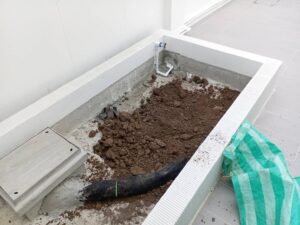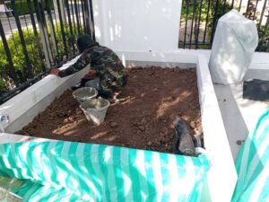 1. ควบคุมการกระจายน้ำหนัก : แรงงานคนใช้รถเข็น (Wheelbarrow) และพลั่วในการแบ่งถ่ายดินปริมาณมากที่กองอยู่ด้านหน้า ไปสู่กระบะปลูกที่อยู่ด้านใน การทำเช่นนี้ ช่วยควบคุมปริมาณดินที่ถูกส่งเข้าไปในกระบะ ซึ่งมีความสำคัญต่อการไม่ให้กระบะรับน้ำหนักเกิน และทำให้การถมดินได้ระดับตามต้องการ